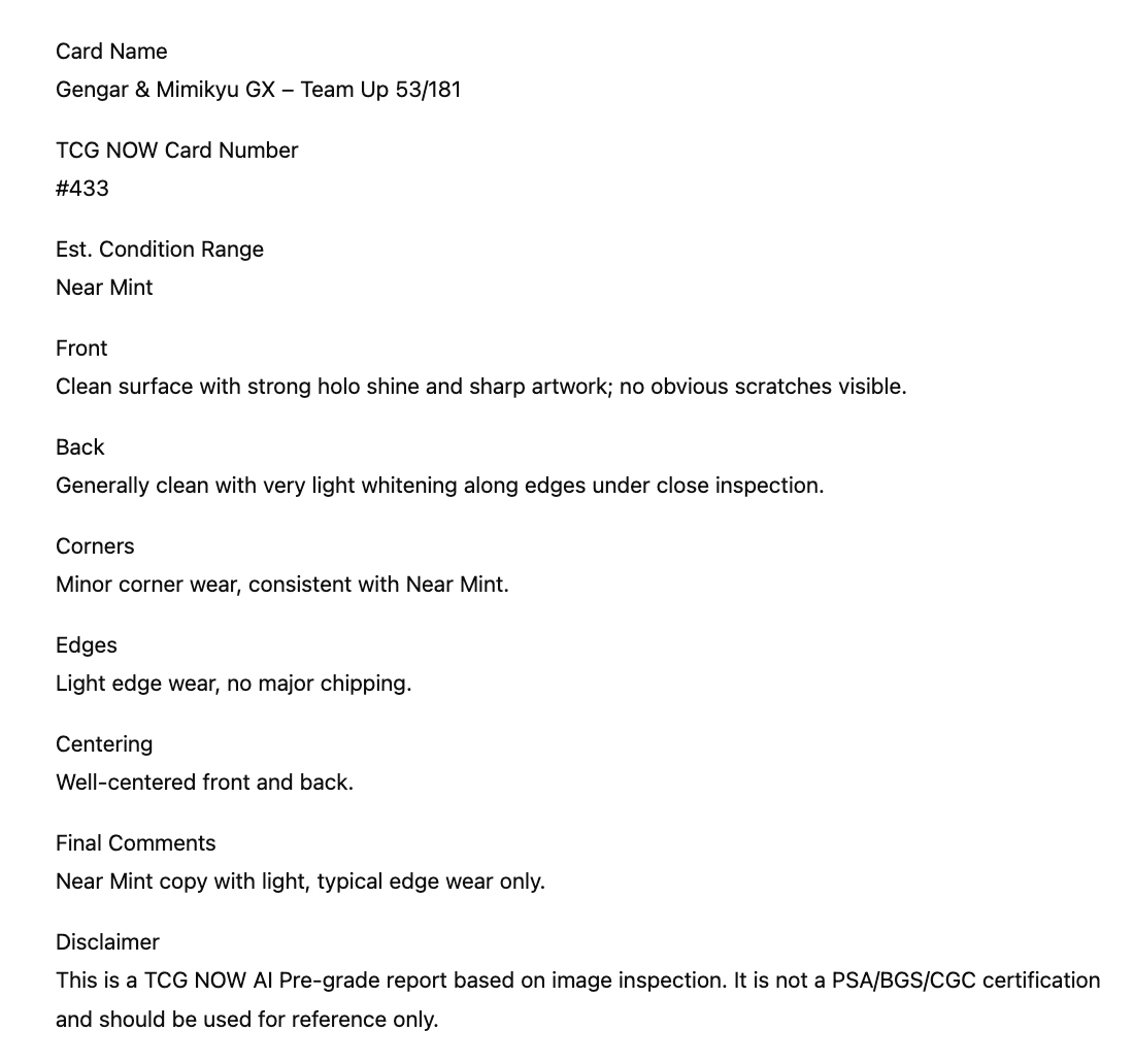 This is a TCG NOW AI Pre-grade report based on image inspection. It is not a PSA/BGS/CGC certification and should be used for reference only.