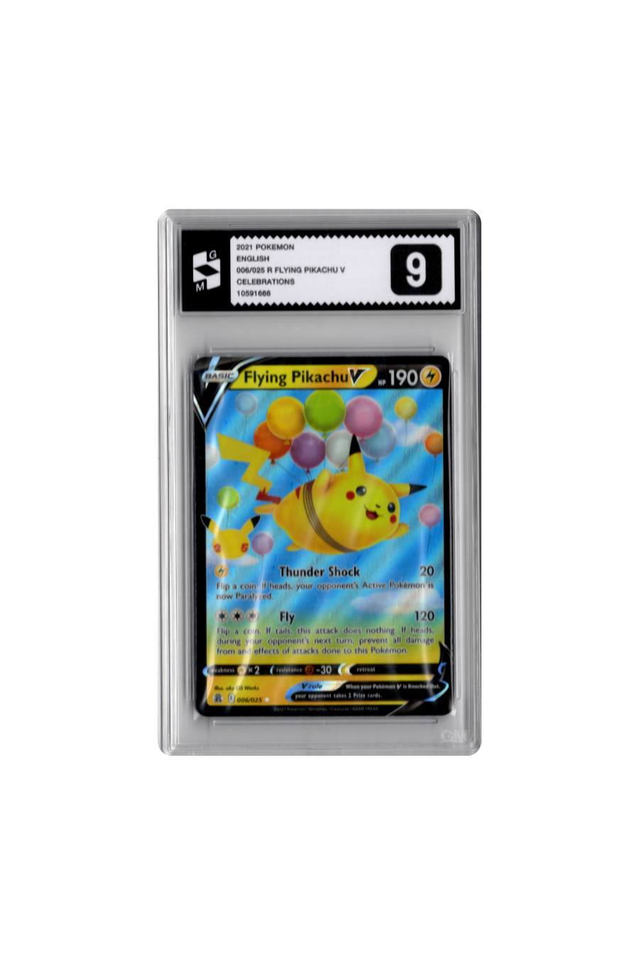 This listing features a Grade Master 9 graded Flying Pikachu V from the Pokémon TCG Celebrations expansion, card number 006/025. Graded by Grade Master, this card shows strong overall condition with light imperfections consistent with the grade. Featuring the iconic Flying Pikachu artwork, it is a popular card among Celebrations collectors and Pikachu fans. Authenticated, securely slabbed, and suitable for display or collection.