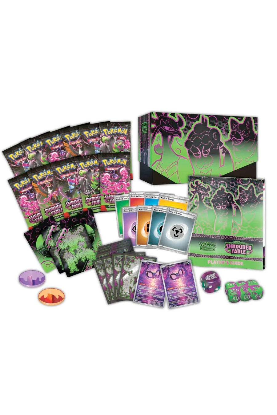 The Shrouded Fable Elite Trainer Box includes 9 Scarlet & Violet—Shrouded Fable booster packs, 1 full-art foil promo card featuring Pecharunt, 65 card sleeves featuring Okidogi, Munkidori, and Fezandipiti, 45 Pokémon TCG Energy cards, a player’s guide to the expansion, 6 damage-counter dice, 1 competition-legal coin-flip die, 2 plastic condition markers, a collector’s storage box with 4 dividers, and a code card for Pokémon Trading Card Game Live.