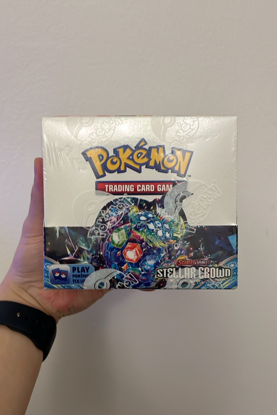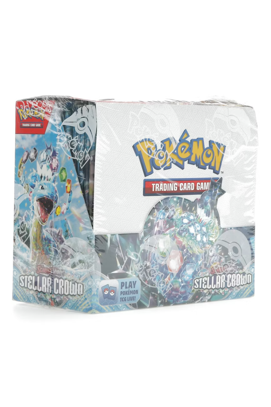 TCGNOW Auction 002 now goes live featuring a Stellar Crown Booster Box from the Pokémon Trading Card Game. This factory sealed booster box contains a total of 36 Stellar Crown booster packs, making it an ideal choice for collectors looking to keep sealed or for players aiming to open a full box experience from the set.